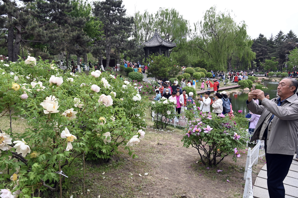 市民张先生早早地来到了牡丹园,他选择一处自己中意的美景,拿出画板和纸笔开始了创作,“这些牡丹花形态各异,你看这边的几朵,竞相开放,好像都不服输的样子,所以我就坐在这里勾画一幅线稿,留作一个美好的纪念吧!”