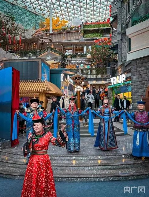 3月11日,一进“山门”,这里正在进行一场蒙古族特色歌舞表演。华丽的民族服饰与颇具年代感的现代山丘景色呼应,马头琴、呼麦伴随着摩肩接踵的人群流淌,沉浸感瞬间代入。“好像过年了。”人群中有人感叹。